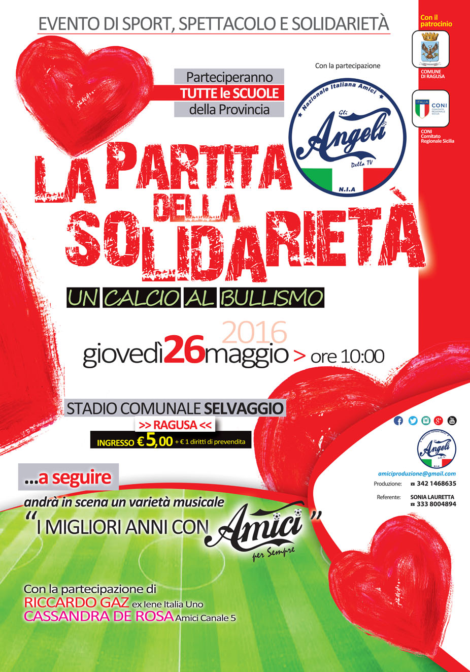 Il progetto di informazione contro il “bullismo”, piaga molto diffusa nel mondo giovanile, è portato avanti da Boris Roberti, Presidente della Nazionale Italiana Amici di Canale 5 che ha voluto che anche Ragusa fosse scelta tra le città italiane in cui svolgere “La partita della solidarietà” che vedrà in campo la propria nazionale con una rappresentativa di giovani studenti.