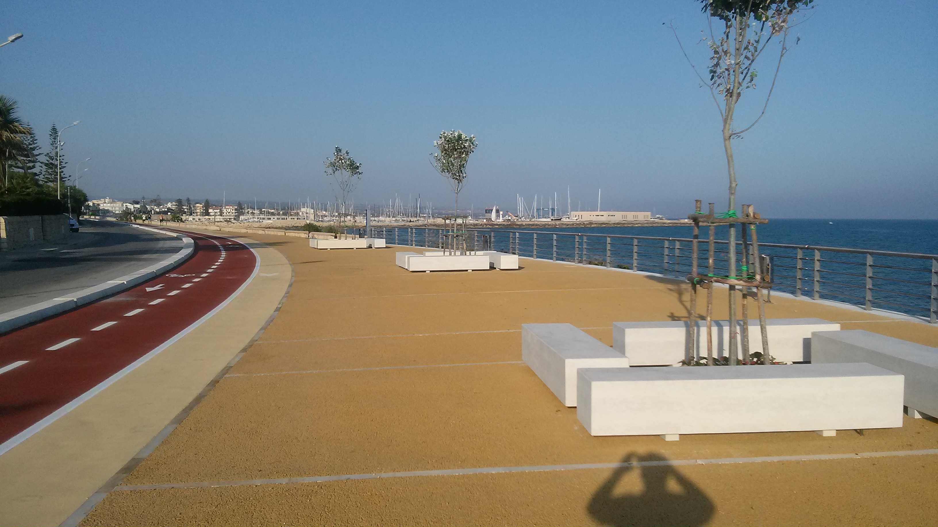 Un tappeto in resina speciale traccia il percorso della pista ciclabile che è stata separata dalla carreggiata riservata ai veicoli con un cordolo centrale verniciato di bianco. Sul lato mare è stato creata anche una corsia pedonale. Realizzata anche la segnaletica orizzontale e verticale che regolamenta il transito delle biciclette e delimita lo spazio pedonalizzato. Tre sono state le imprese impegnate nell'esecuzione dell'opera pubblica una delle quali ha realizzato nell'area della lunga curva prospiciente la scogliera, in corrispondenza del Villaggio dei Gesuiti, un delizioso punto di aggregazione al servizio della pista ciclabile. Nel grande slargo infatti oltre ad essere stata montata una lunga ringhiera in acciaio che ha preso il posto dei muri in cemento, sono stati realizzate, nei due punti di accesso alla scogliera, delle docce pubbliche, piantumati degli alberi, installati dei sedili in pietra con delle luci led incassate nella parte sottostante; una soluzione tecnica questa che nelle ore serali e notturne conferirà un particolare effetto scenico al sito.