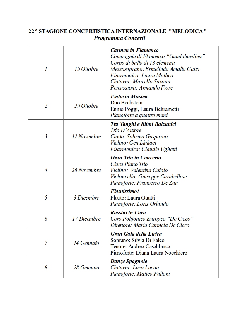 Inizia il prossimo ottobre al Teatro Don Bosco la 22^ Edizione della Stagione Concertistica Internazionale “Melodica”