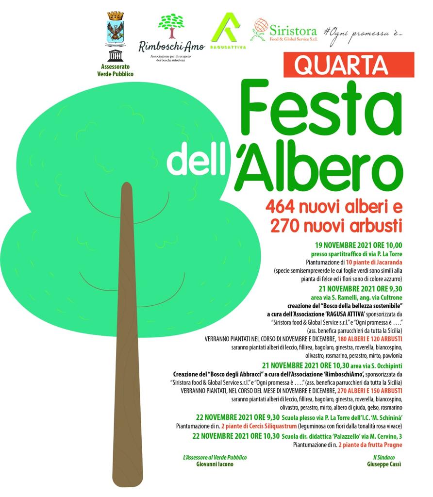 Si inizierà giorno 19 novembre, alle ore 10, con la messa dimora di 10 piante di Jacaranda presso lo spartitraffico di via Pio La Torre. Si proseguirà giorno 21 novembre con un primo appuntamento, alle ore 9,30, nell’area di Via Ramelli, angolo via Cutrone, con la creazione del “Bosco della bellezza sostenibile” a cura dell’associazione “Ragusa Attiva.” In tale sito verranno messi a dimora nel corso dei mesi di novembre e dicembre 180 alberi e 120 arbusti . A seguire, intorno alle 10,30, in via S. Occhipinti a cura dell’associazione “Rimboschiamo”, si darà vita al “Bosco degli Abbracci” in cui troveranno spazio 270 alberi e 150 arbusti. Entrambe le iniziative del 21 novembre sono sponsorizzate della società “Siristora” e dell’associazione “Ogni persona è…”.