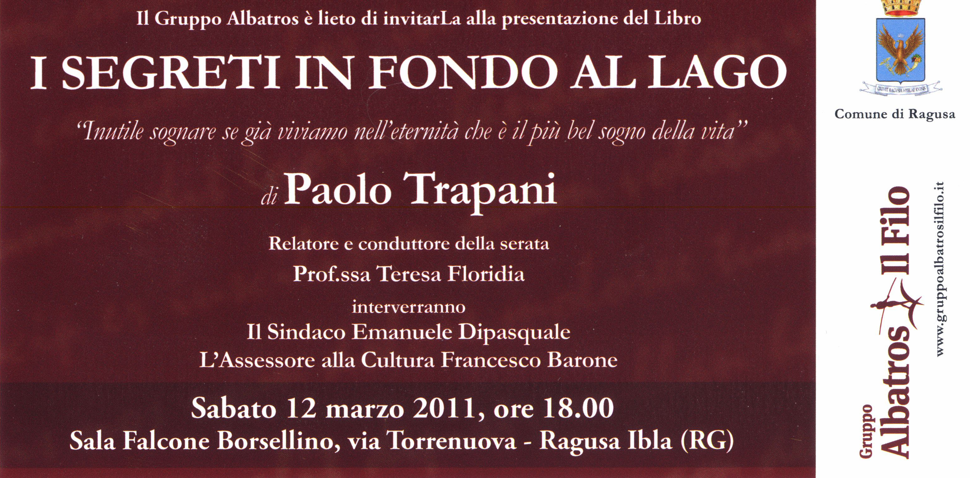 Presentazione libro:"I segreti in fondo al lago" - 12 marzo - Sala Falcone Borsellino - Ragusa Ibla