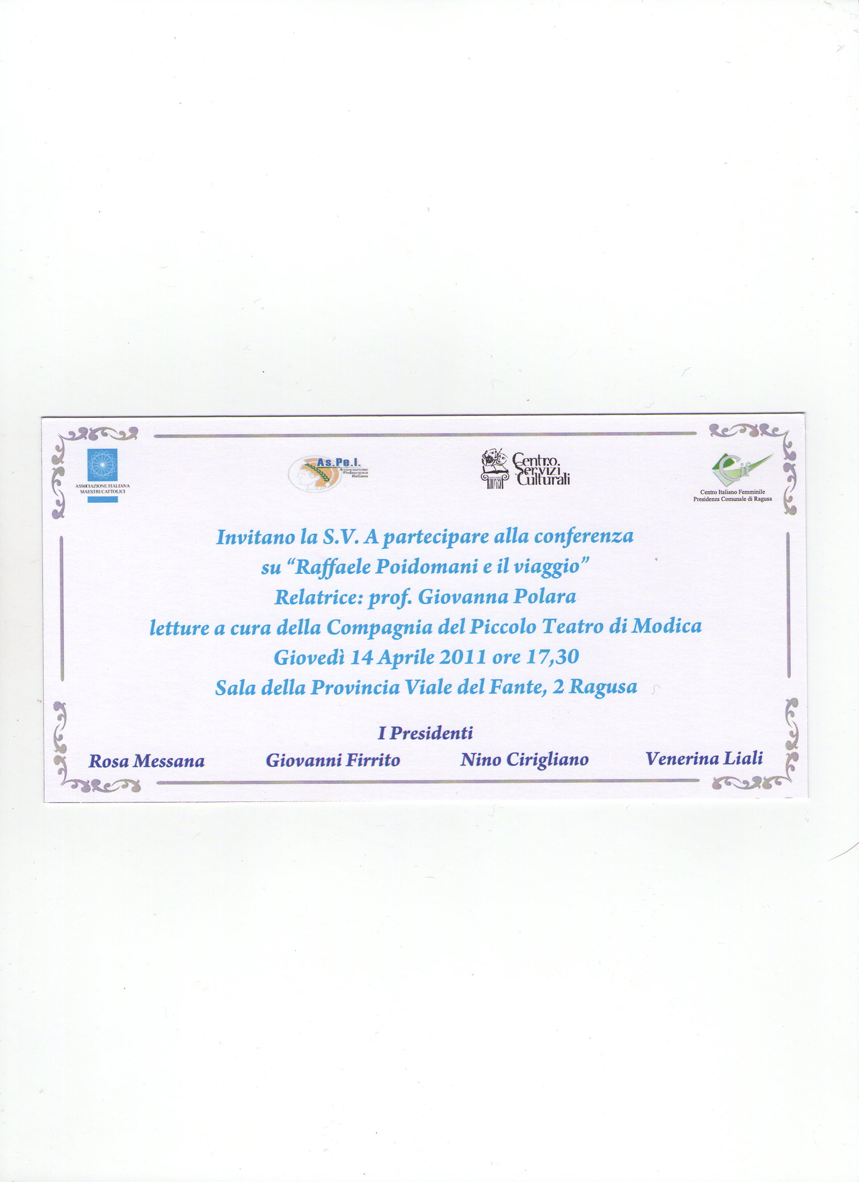 Si terrà giovedì 14 aprile alle ore 17.30 presso la Sala della Provincia in Viale del Fante,2 a Ragusa la conferenza sul tema:"Raffaele Poidomani e il viaggio".