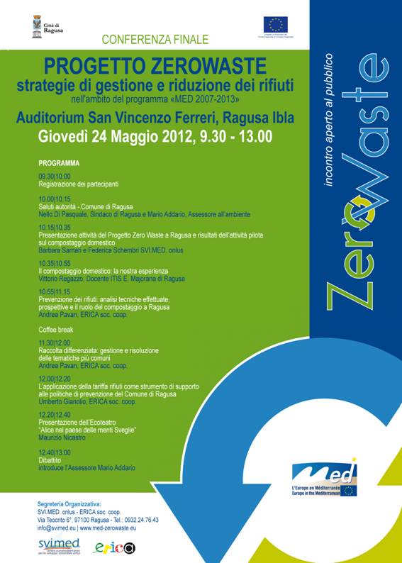 Si informa la cittadinanza che, giovedì 24 Maggio 2012, dalle ore 9.30 alle ore 13.00 presso l’auditorium “San Vincenzo Ferreri” a Ragusa Ibla, nell’ambito del progetto “Low Cost Zero Waste Municipality” del Programma MED 2007 – 2013, si svolgerà un convegno con dibattito sulle problematiche riguardanti la gestione dei rifiuti a Ragusa, con particolare riguardo alla raccolta differenziata, al compostaggio domestico, all’eventuale introduzione della tariffa.