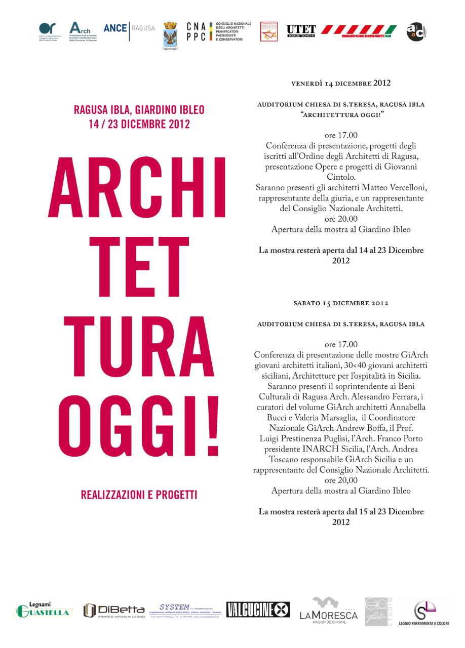 Saranno presenti il soprintedente ai Beni Culturali di Ragusa Arch.Alessandro Ferrara, i curatori del volume GiArch architetti Annabella Bucci e Valeria Marsiglia, il Coordinatore Nazionale GiArch Andrew Boffa, il Prof.Luigi Prestinenza Puglisi, l'Arch.Franco Porto presidente INARCH Sicilia, l'Arch.Andrea Toscano responsabile GiArch Sicilia e un rapprsentante del Consiglio Nazionale Architetti.