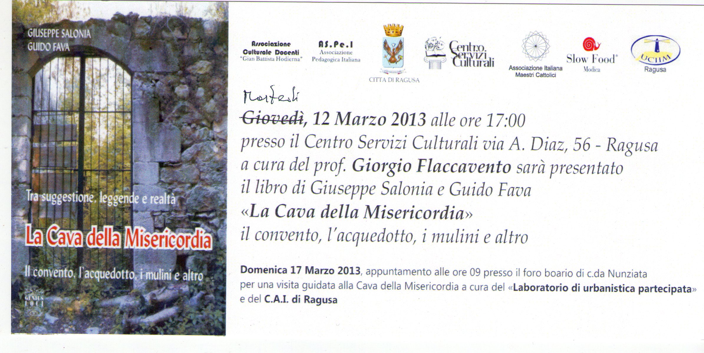 Si informa che Domenica 17 Marzo 2013 appuntamento alle ore 9,00 presso il foro boario di c.da Nunziata per una visita guidata alla Cava della Misericordia a cura del “Laboratorio di urbanistica partecipata” e dei C.A.I. di Ragusa
