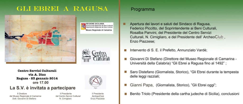 Si terrà giovedì 23 gennaio 2014 alle ore 17,00 presso i locali del Centro Servizi Culturali - Via A.Diaz, 56 a Ragusa la Conferenza "Gli Ebrei a Ragusa", organizzata dal Museo Regionale di Camarina, in collaborazione con Archeoclub Sez. di Ragusa e Centro Servizi Culturali.
