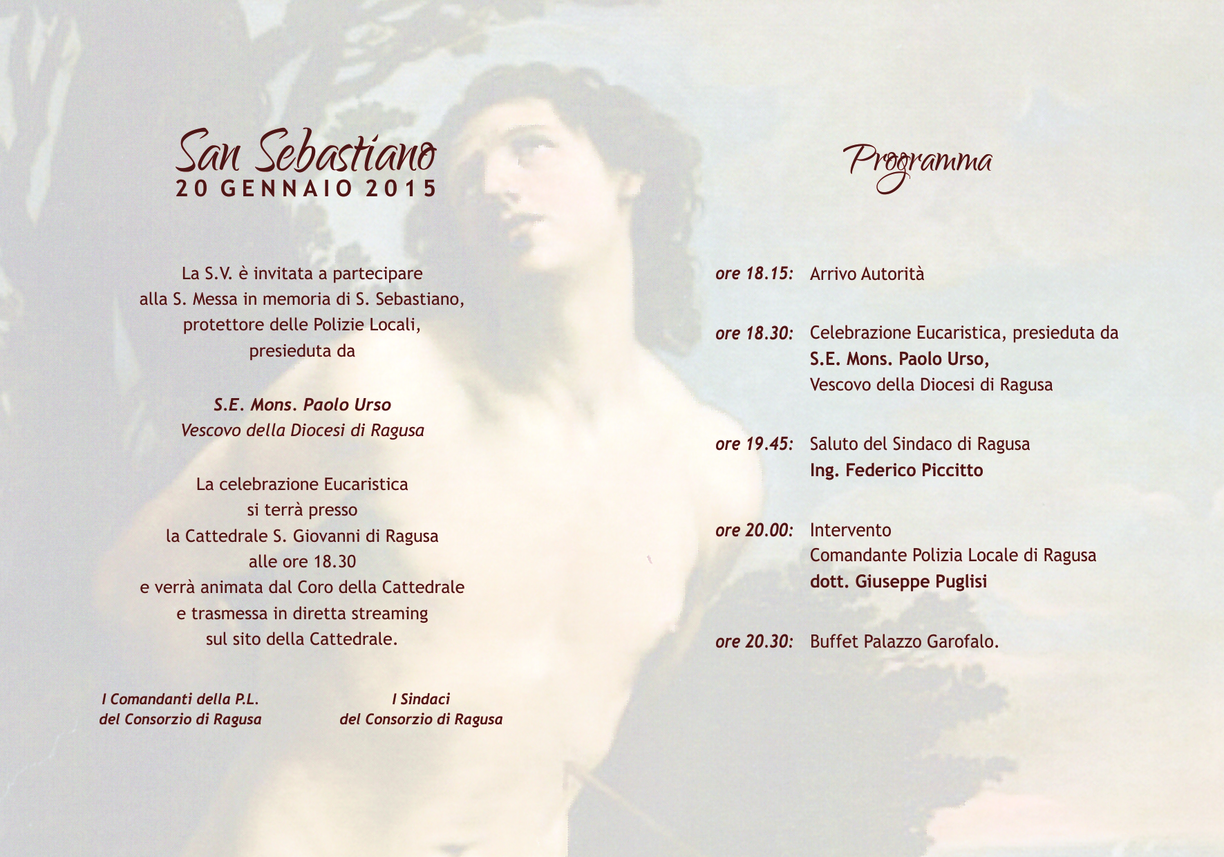 Giorno 20 Gennaio, presso la Cattedrale di S. Giovanni Battista, alle ore 18.30, si svolgerà la celebrazione in onore di San Sebastiano - Patrono della Polizia Municipale.