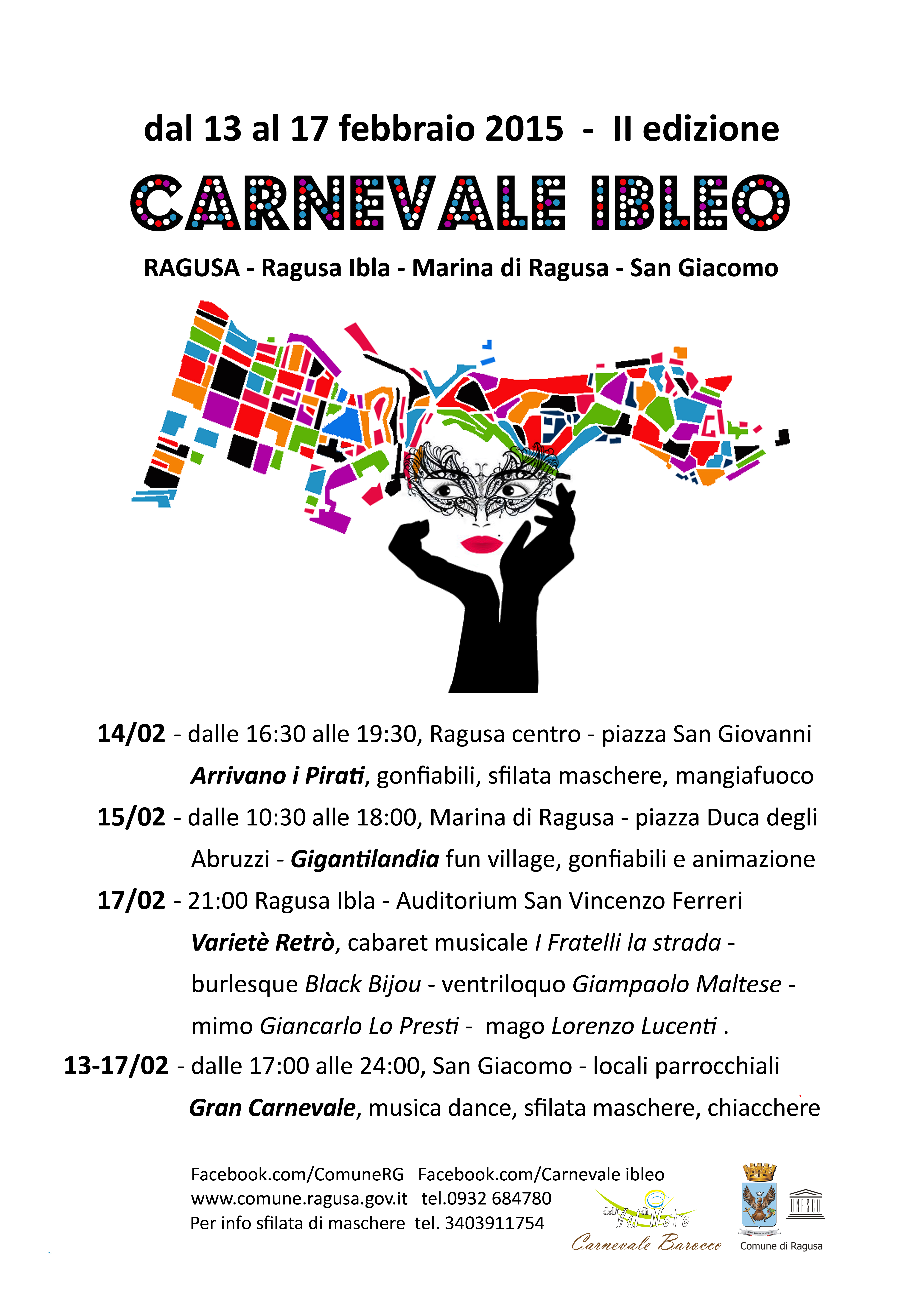 Dal 13 al 17 Febbraio, presso Ragusa, Ragusa Ibla, Marina di Ragusa e San Giacomo, si svolgerà la seconda edizione del Carnevale Ibleo.