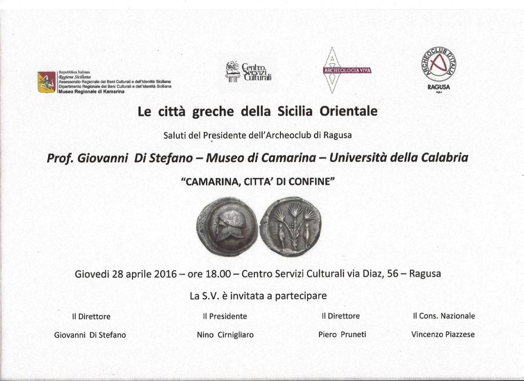 invitano alla Conferenza “Camarina, città di confine” che si terrà Giovedì 28 aprile 2016 alle ore 18,00 presso il Centro Servizi Culturali (Via A.Diaz, 56 – Ragusa)