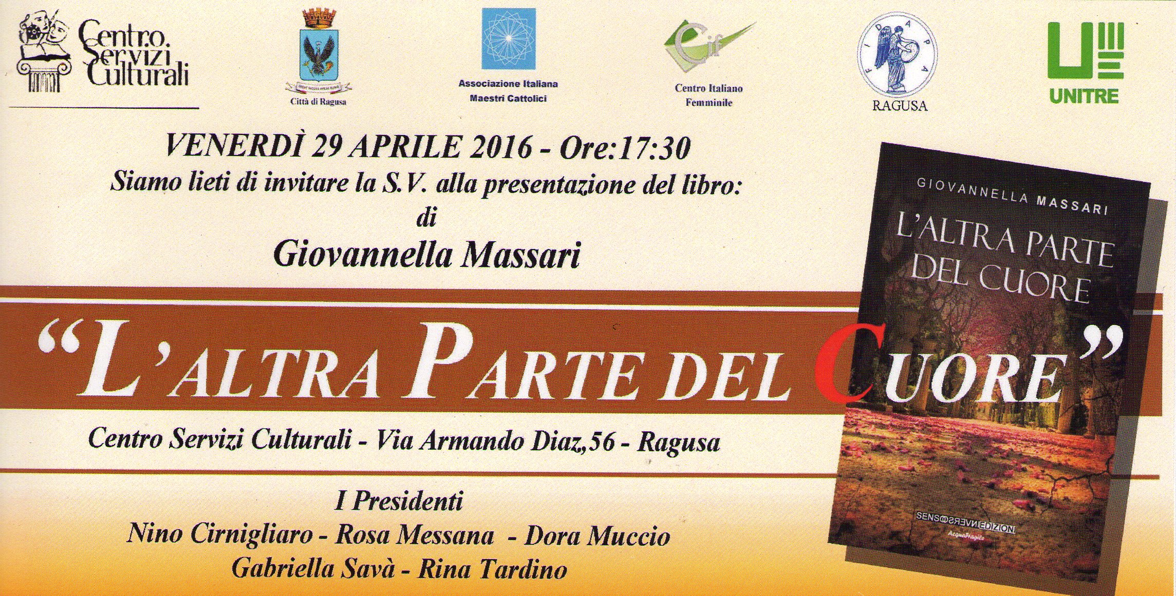 Centro Servizi Culturali di Ragusa invita alla presentazione del libro di Giovannella Massari “L’altra parte del Cuore” che si terrà Venerdì 29 aprile 2016 alle ore 17,30 presso la sala del Centro Servizi Culturali sita in Via A.Diaz, 56 – Ragusa