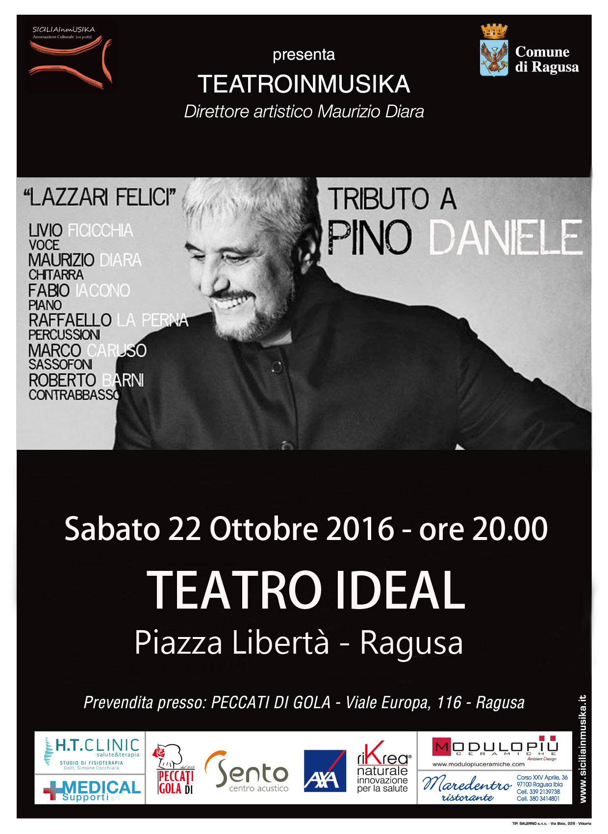 Organizzato da TeatroinMusika con il patrocinio del Comune di Ragusa e la Direzione Artistica di Maurizio Diaria si svolgerà Sabato 22 ottobre alle ore 20,00 presso il Teatro Ideal (Piazza Libertà – Ragusa) il concerto Tributo a Pino Daniele.