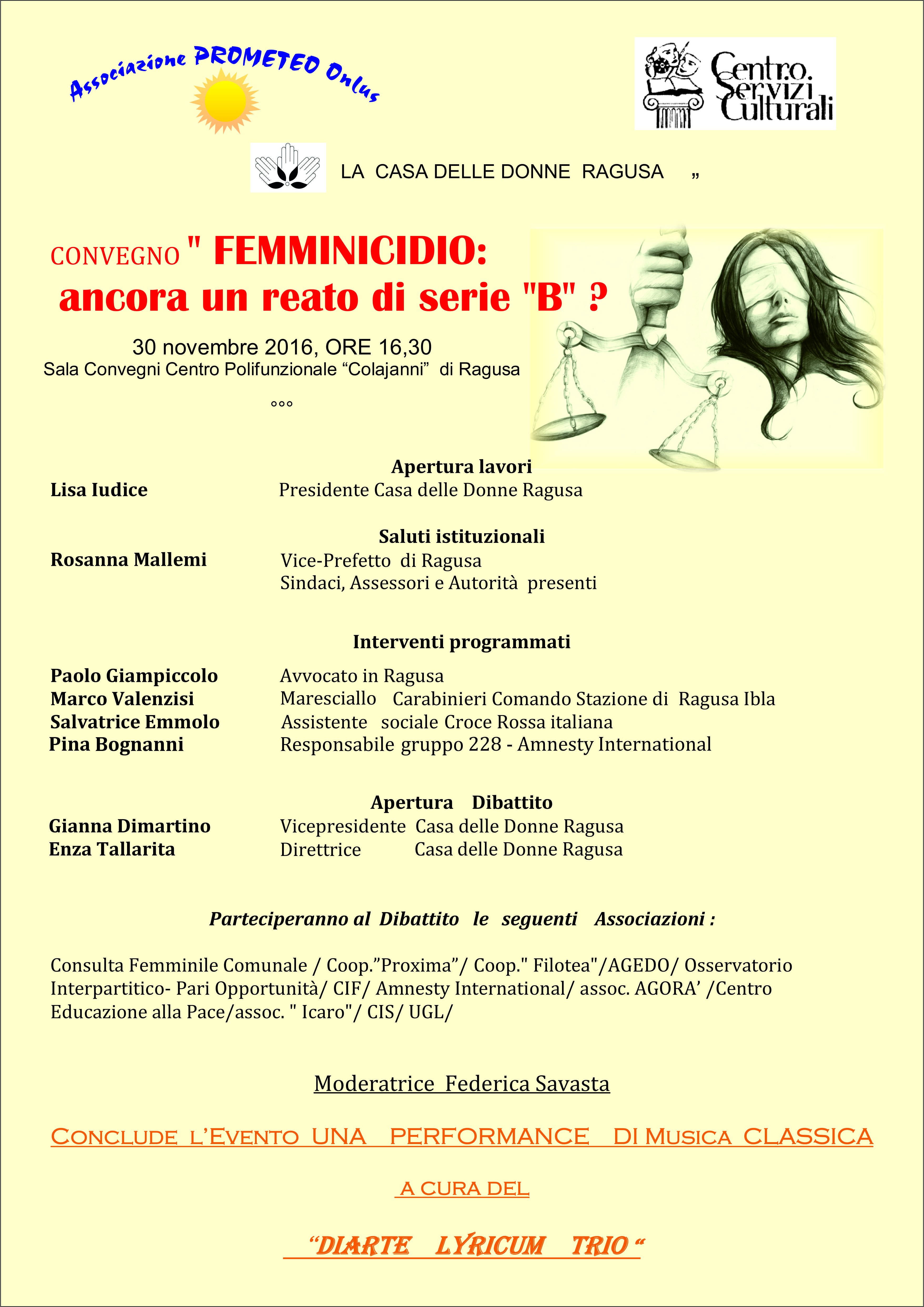 Convegno: “Femminicidio: ancora un reato di serie B?" - 30 novembre - Sala Convegni del Centro Polifunzionale “Colajanni” Ragusa