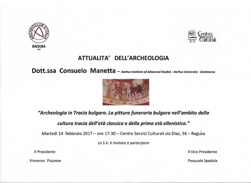 Conferenza "Archeologia in Tracia bulgara. La pittura funeraria bulgara nell'ambito della cultura tracia dell'età classica e della prima età ellenistica" - 14 febbraio - Centro Servizi Culturali (Via A.Diaz, 56 – Ragusa)