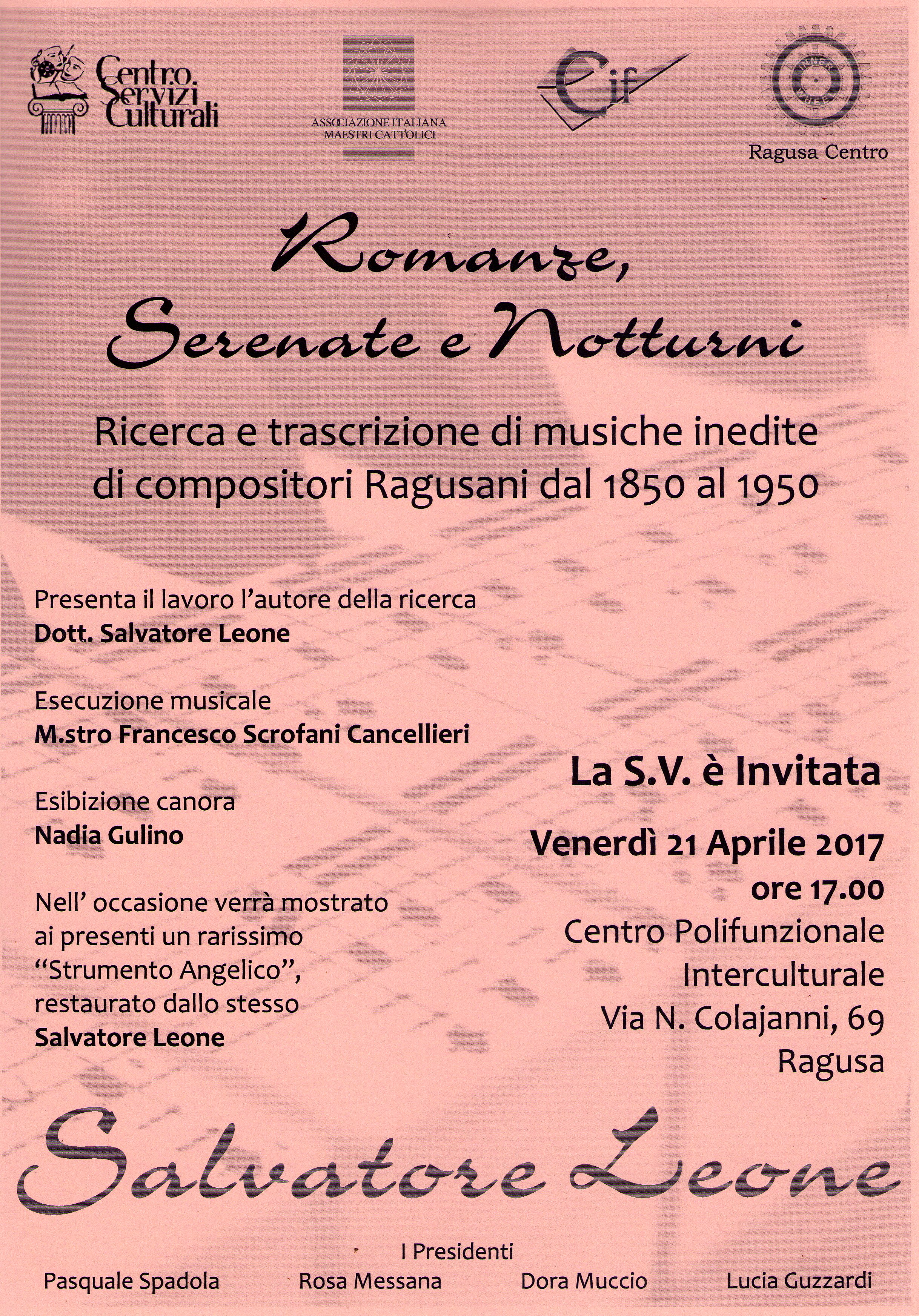 “Romanze, Serenate e Notturni” – Ricerca di trascrizioni di musiche inedite di compositori ragusani dal 1850 al 1950 - 21 aprile - Centro Polifunzionale Interculturale (Via N. Colajanni, 69 – Ragusa)