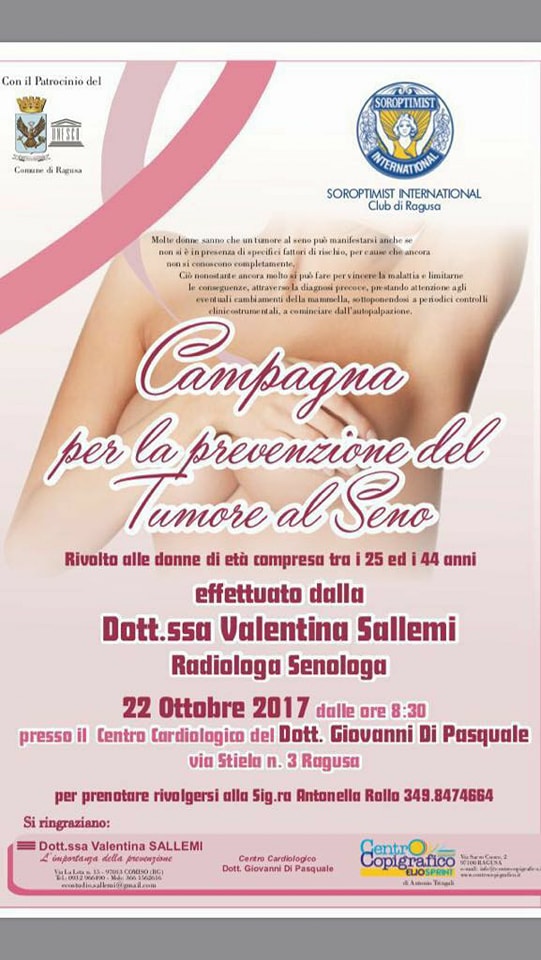 i 25 ed i 44 anni, effettuato dalla Dott.ssa Valentina Sallemi (Radiologa senologa) che si terra domenica 22 ottobre 2017 dalle ore 8,30 presso il Centro Cardiologico del Dott. Giovanni Di Pasquale (Via Stielo, 3 – Ragusa).