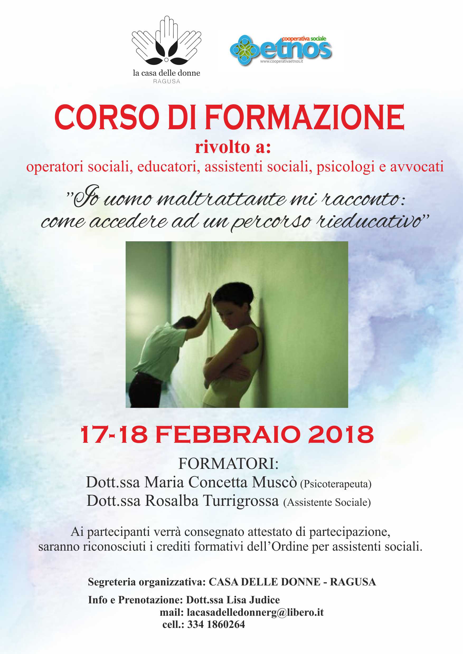 Corso di formazione:""Io, uomo maltrattante mi racconto: come accedere ad un percorso rieducativo" - 17 e 18 febbraio