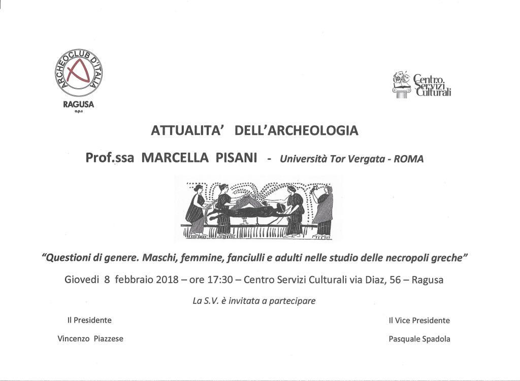 L'Archeoclub d'Italia, sezione di Ragusa con Centro Servizi Culturali "E.Schembari" invita alla Conferenza tenuta dalla prof.ssa Marcella Pisani (Università Tor Vergata – Roma) dal titolo "Questioni di genere. Maschi, femmine, fanciulli e adulti nello studio delle necropoli greche" che si terrà Giovedì 8 febbraio 2018 alle ore 17,30 presso il Centro Servizi Culturali "E.Schembari" (Via A.Diaz, 56 – Ragusa)