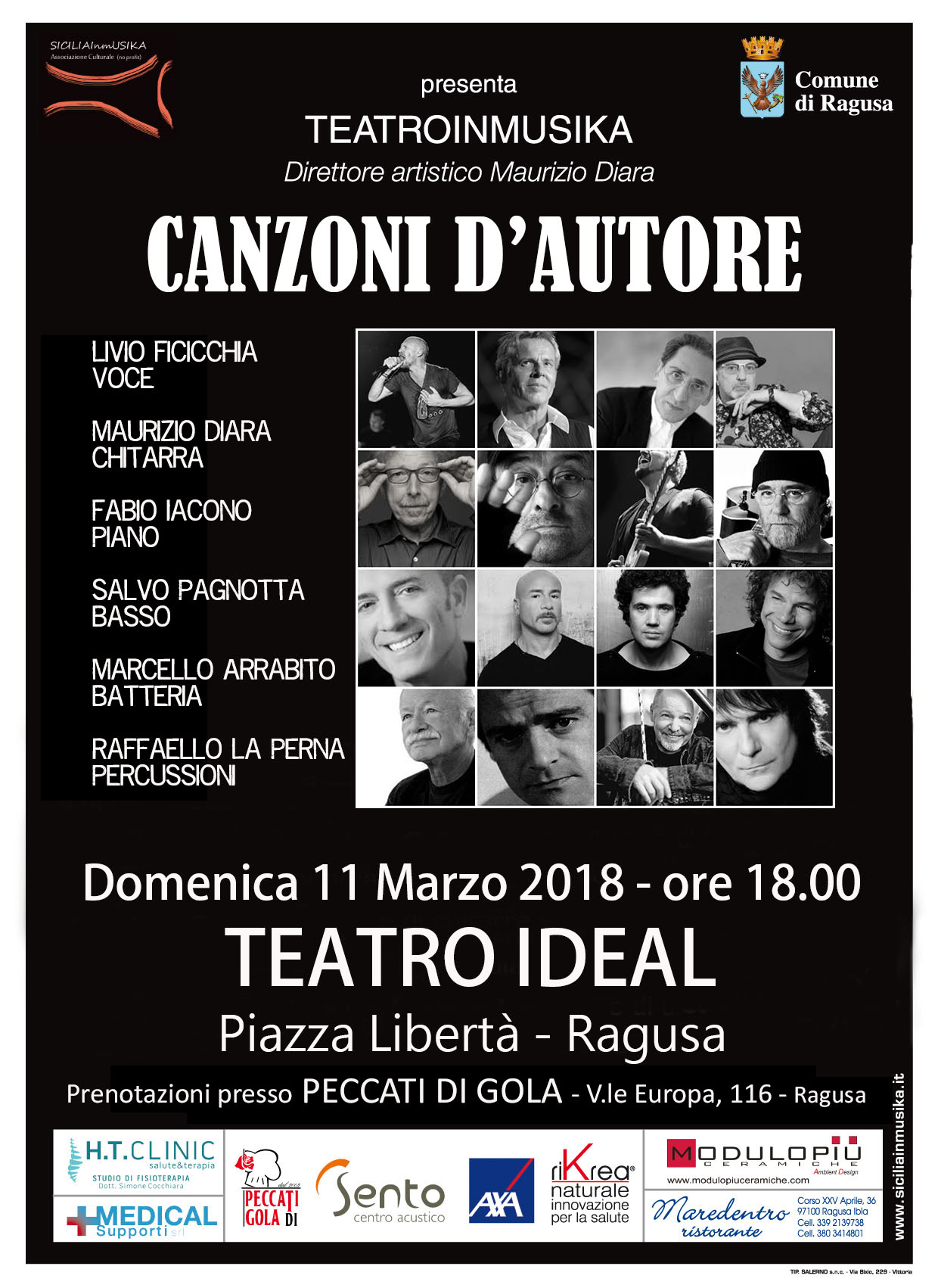 A cura dell'Associazione Culturale SiciliainMusika con la Direzione artisitica di Maurizio Diaria si svolgerà Domenica 11 marzo 2018 alle ore 18,00 nell'ambito di TeatroInMusika presso il Teatro Ideal (P.zza Libertà – Ragusa) il concerto "Canzoni d'Autore".
