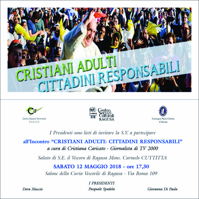 invita all'Incontro "Cristiani adulti: Cittadini responsabili" a cura di Cristiana Caricato – Giornalista di Tv2000 che si svolgerà Sabato 12 maggio 2018 alle ore 17,30 presso il Salone della Curia Vescovile di Ragusa (Via Roma, 109).