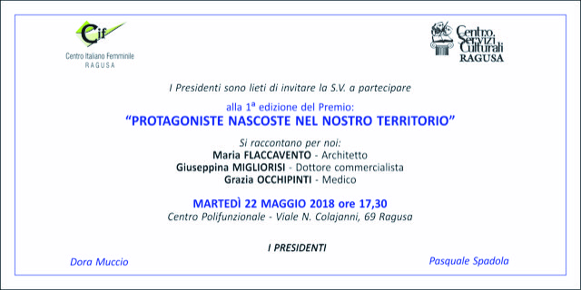 Il C.I.F. (Centro Italiano Femminile) con Centro Servizi Culturali "E.Schembari" di Ragusa invita alla 1° Edizione del Premio "Protagoniste nascoste nel nostro territorio" che si terrà oggi, Martedì 22 maggio 2018 alle ore 17,30 presso il Centro Polifunzionale (via N.Colajanni, 69 – Ragusa)