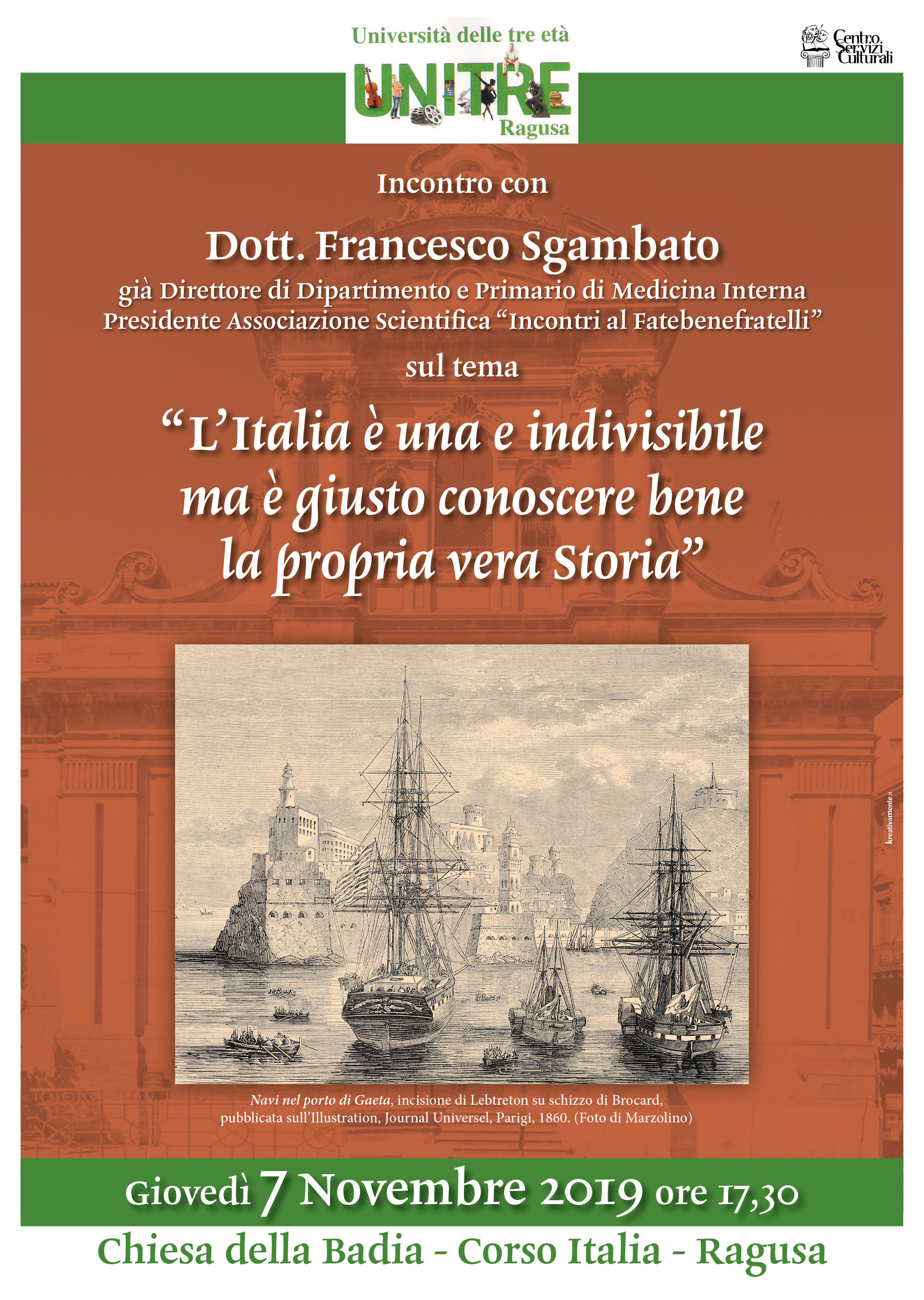 Interverrà il Dott. Francesco Sgambato, già Direttore del Dipartimento di Medicina Interna al Fatebenefratelli di Benevento, attuale Presidente dell’Associazione Scientifica “Incontri al Fatebenefratelli”, con una relazione sul tema “L’Italia è una e indivisibile ed è giusto conoscere la propria storia”, che verrà sviluppato dal relatore in modo del tutto originale.